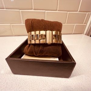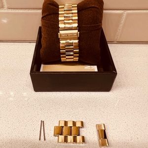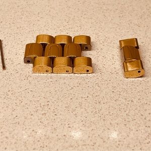 Polished Gold Tone Stainless Steel. Extra Links and Pins Included and Battery was replaced on 5/18/22. Excellent condition - only worn a handful of times and no visible scratches.