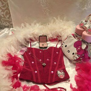 gorgeous sapphire pink vinatge y2k corest with laces up back little meatl kitty charms hang from the back laces,hello kitty embroidery on the front side ;and crystal bubbles floating across the front make it super special! comes with cute matching silver hello kitty pendent just add your faviotire chain! fits size small to sm large as the lace up back makes it adjustable!ALWAYS open to offers or just hit the like button and ill send you a great one see my closet for tons more custom hello kitty bikinis,tracksuits lingere,ect and pls follow me for more to come daily!