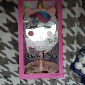 Love. Ellie LED unicorn mirror has a storage base and USB cord port to make the unicorn mirror perfect for any occasion. The mirror tilts 360 Degrees for great angles. Great gift or get for yourself. Takes 4 AAA batteries (not included). New in package.