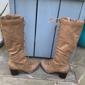 Distressed Vegan leather Nine West lace up boots. I believe I only wore these once to work so they are in great condition. Small water spot on one but kind of blends with the distressed look.