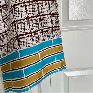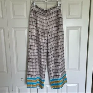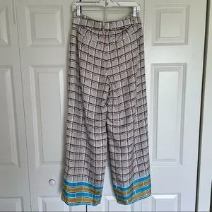 Here we’re elevating pajama dressing with a retro flair! These high-rise, wide-leg silk pajama trousers feature pleats, a classic zipper fly closure, side slant pockets, a matching belt, and they’re LINED! The fabric boasts a brown grid design while the hems are detailed with a jewel-tone teal and dirty mustard brick pattern.