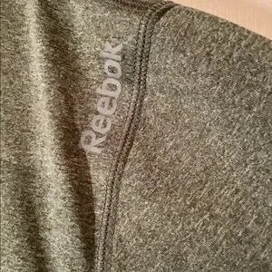 Olive green. Soft touch. Upscale from the average t-shirt. Word Reebok is stamped on left side where shoulder meets sleeve. Smoke free home. 100% Polyester.