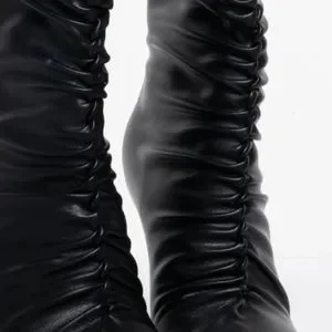 The AZALEA WANG Crazy In Love Stiletto Bootie is a black faux leather bootie featuring a faux leather base, a ruched front detailing, a square toe, and a stiletto heel. Complete with a classic side zipper closure.