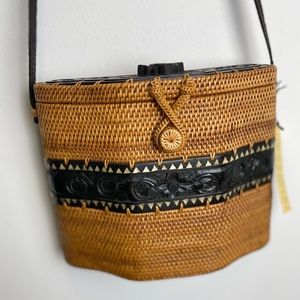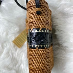 NWT DEWI hand Woven Rattan Carved Wood Balinese Tote Bag Handbag