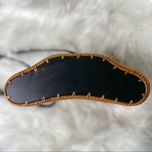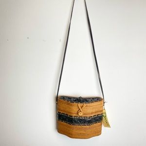 Artisanal Organic handmade rattan bag, in classic tan and black color. New with tags. This bag is part of an estate collection of basket collectors with a love for Hawaii & Bali