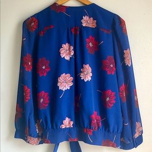 Floral wrap top with surplice neck and 3/4 sleeves with button cuffs.