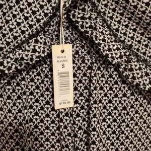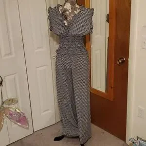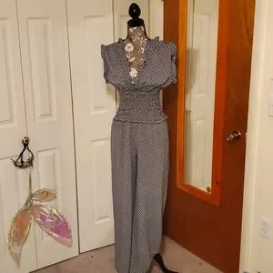 black and white patterned jumpsuit with smocked waist and ruffle sleeves. pockets! size small.