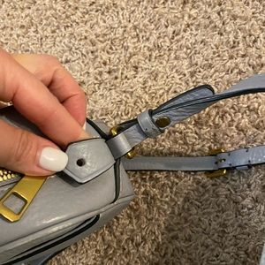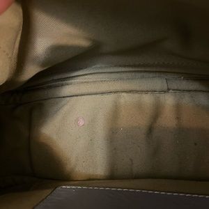 Pink mark on inside of bag (I believe it is a small drop of nail polish) slight blue color transfer on backside of back from denim contact. See photos.