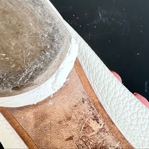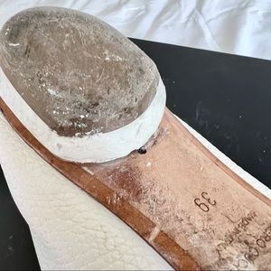 Good condition. Heels have had some repair work, scuffs and scratches on the shoes have been repaired. Some fading on interior.