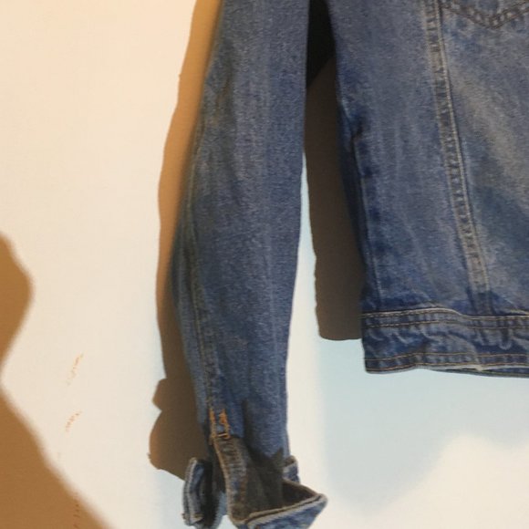 Fun little cropped denim jacket. Can be worn with dresses, rompers, jeans, just about anything, it's a great look. It's 100% cotton, washable and is in great condition.Two pockets,six metal buttons, size medium. Wear sleeves up or down, looks terrific.