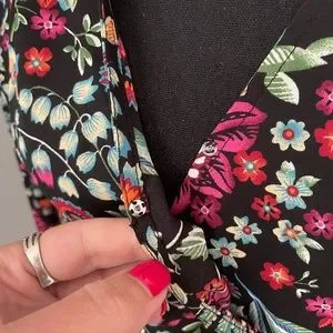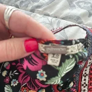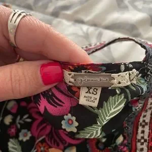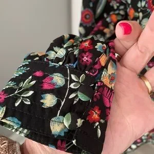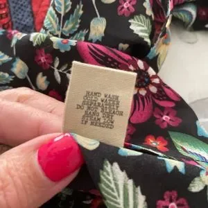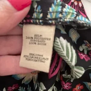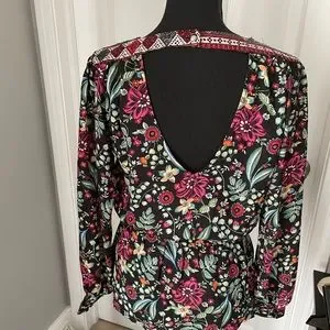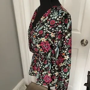 Floral chiffon top from Gimmicks. Elasticized waist. Wrap front with snap closure. Button cuffs . Colorful Back strap with button closure. 24 inches long. Wore once