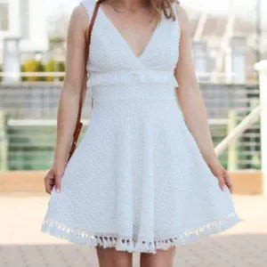 A crochet lace overlay shapes a plunging surplice neck and back, and fitted waist with fun, tassel accents. Full skater skirt with more tassels on the hem completes this flirty style. Hidden side zipper.