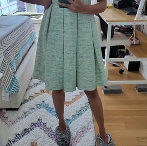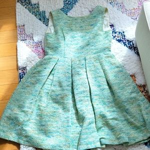 anthropologie paper crown dress with lining in various shades of green and blue