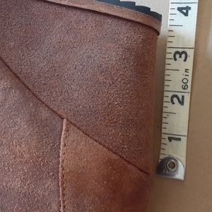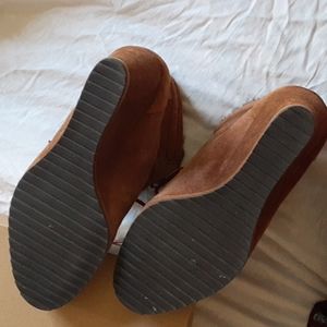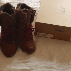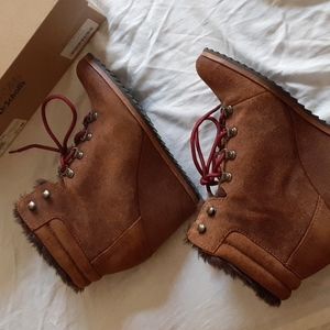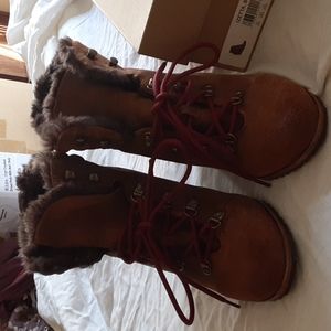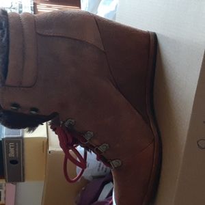 Sueded Leather, Faux Fur Lined, Wedge Heel, Traction Soles, Classic Red Laces, Brass Hooks and Loops. Marked 8 1/2, but they run small and are a perfect size 8. Worn Once. Perfect condition. Love them, but can no longer wear heels.
