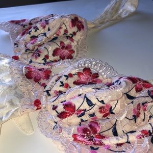 Ribbon tie in back which gives size versatility (see pics for measurements)