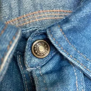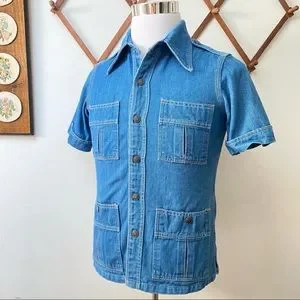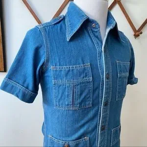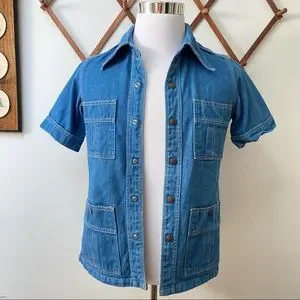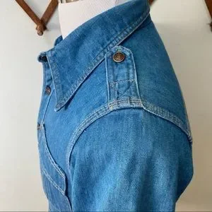 What’s cool? Amazing vintage 1960s 1970s piece, great quality denim, four pocket front, epaulette military shoulders, snap button enclosure, pointed collar, classic American medium wash blue, excellent quality, vintage made in USA