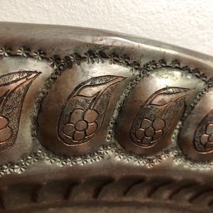 Vintage engraved patinaed copper tray side table with folding wooden base.