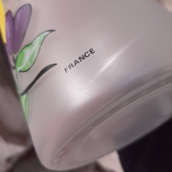 Made in France, beautiful set of fruit glasses and pitcher..all mint condition. Pitcher is 8" x 4" glasses are 5 1/4 " tall.