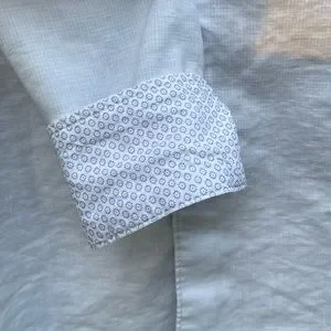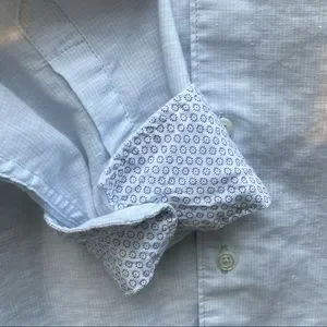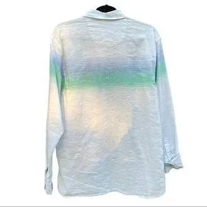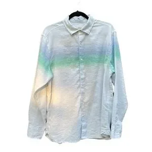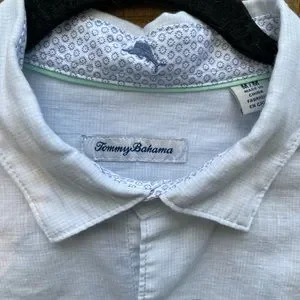 Tommy Bahama Horizon Heights Stretch Sport Shirt in Jade Cream provides luxurious, breathable comfort in a lighter-than-air top, and the extra touch of stretch in this shirt gives you an even better sense of freedom. A lightweight, moisture-wicking, linen blend, breathable fabric that has a breezy feel. Ultrasoft mechanical stretch woven fabric provides easy mobility. Engineered stripe pattern at chest, back and sleeves. Contrast medallion-print pattern at interior cuffs and collar. Button-front placket. Regular Fit. Double button cuffs. Spread collar with under-buttons to keep them in place on breezy beaches. Bradley collar. Shirttail hem. Contrast details in collar and cuffs. Tags were removed, but this shirt is brand new, never worn. My neighbor bought it at Wrightsville Beach this spring along with several others. Too small for him, so he generously gave them to me. No tags.