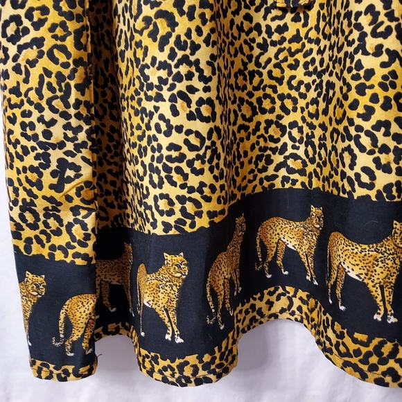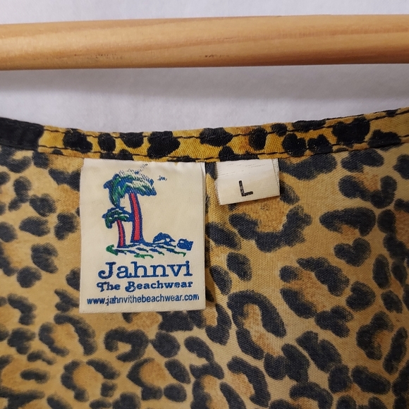 This dress is super cute and comfortable. It has a tiger print and at the bottom there are leopards all the way around. It is a size large and the material is 100% terrivoile. This garment measures 36 inches from the top of the shoulder to the bottom of the dress. This can also be used as a beach cover up.
