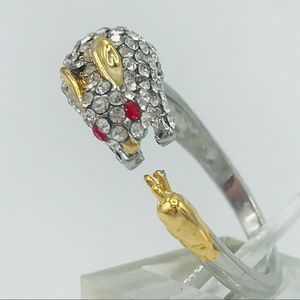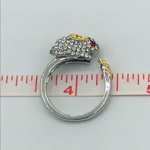 Shiny bunny chasing the carrot. Adorable ring and so sparkly with its white coat and red eyes. The ears, nose & carrot are gold. This small ring adds a bit of whimsy & flash to your day or night. This ring is not adjustable.