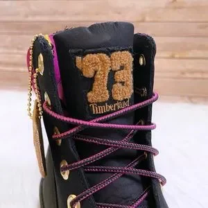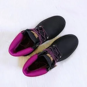 New In Box- Timberland Women’s Heritage 6 Inch Waterproof Boots In Black Nubuck Leather With Pink Padded Collars, Seam-Sealed Construction, 200g PrimaLoft Insulation, Anti-Fatigue Footbeds And Rubber Lug Outsoles.
