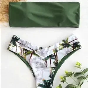 Super cute and flattering bikini. Top is forest green and bottoms have coconut tree print. Bottoms are cheeky but definitely not a thong. Questions? Ask below in the comments! 😇