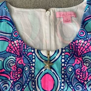 Gorgeous EUC Lilly Pulitzer Abigail Shift Dress in Sea Jewels print. Shades of cobalt, aqua, lavender, periwinkle white, and neon hot pink in a print of fish, seahorses, scallops, and waves. Gold tone starfish pull on hidden front quarter zip. Back hidden zip, bra keeps, sparkly Lilly lace hem tape, tacked lining. 100% cotton. Fabric does not stretch. No flaws to disclose. By far the best available price in this size on Posh as of 11/13/2025.
