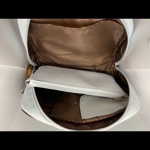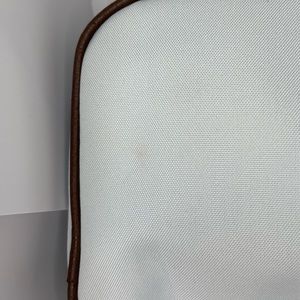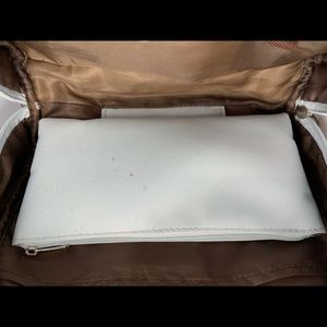 Light blue Calvin Klein makeup bag with brush holders and a smaller zipper pouch on the inside. The original zipper attachment is missing so I replaced it with a ribbon for easy opening.