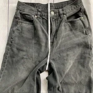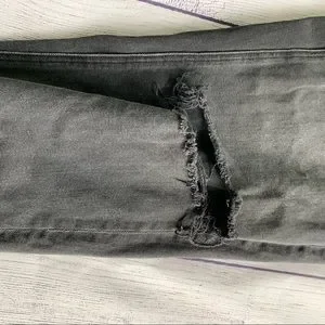 Holes in knees by design, raw hems at bottom by design. Please see all pictures and measurements in pictures.
