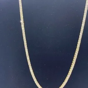This 18k Gold Plated 925 silver moissanite tennis chain necklace features a row of brilliant 3mm moissanite stones over glimmering gold plating & real 925 silver. Natural diamond shine at lab grown prices! Long lasting luster, durable, guaranteed to pass as moissanite on diamond testers, and ships within 1 business day.