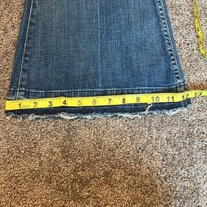 Received as showroom sample, so these don’t have E&J tags on them, but the button closure has the Textile branding. Flare style with raw edge. Images show waist, inseam, and leg opening measurements.