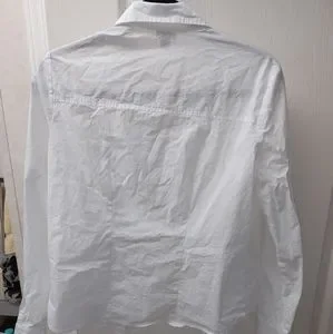 Many darts provide lots of feminine shape to this slightly stretchy shirt. Shaped top placket forms a nice V neck. 21 1/2 " long, 20" wide at armpits. TCM. Size 14.