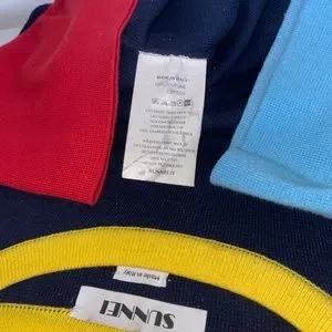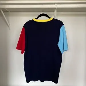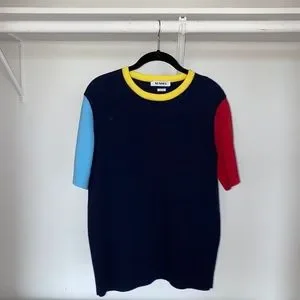 sunnei heavy knit navy t colorblocked with red & aqua sleeves & yellow collar