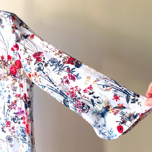 Shift dress in orange floral pattern. 3/4 sleeve. 12" side slits at bottom (last photo).