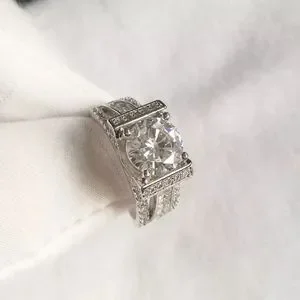 Beautifully crafted, with 925 stamped on the band with mirror polished. Trimmed In 2mm and 1mm sparkling Diamonds, on each side of the band. The front and back side is set off with a V Shape, that embellished the the simulated Sparkling, Absolutely Incredible 8mm Round Diamonds Gemstone, set in a Classic 4 prong setting. Cut and Clarity is Georgous, and delivers a rainbow of Shimmering colors that reflect light Absolutely Gorgeously..