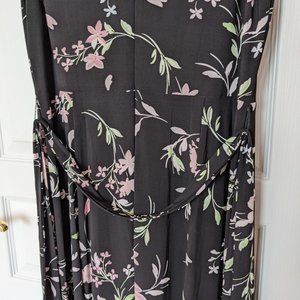 Here is a flowy, stretchy long dress (one piece) by Anne Klein - size 10. There is a tie made of the same fabric (held on by two thread loops on either side of the waist). The top is lined with a similar fabric. There is a zip in the back, see picture to see how low it goes. The detailed pics show the color of the flower print better - its not a bold pink, but its not pale either. 18" pit-to-pit.