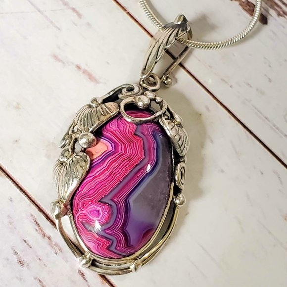 This gorgeous pink & purple Laguna Lace Agate stone from Chihuahua, Mexico is set in this artist designed botanical pendant. Detailed hand carved leaves and vines wrap around this solid sterling silver pendant mounting, encasing this unique stone perfectly. A large decorative leave chain bail accommodates many sizes of chains.