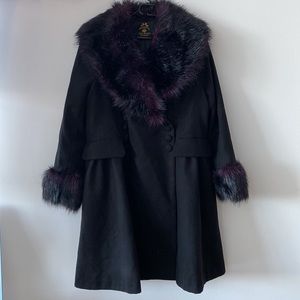Coat with purple-tinged faux fur collar and cuffs.