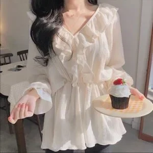 Ruffle blouse top long sleeve lightweight Summer spring top cream