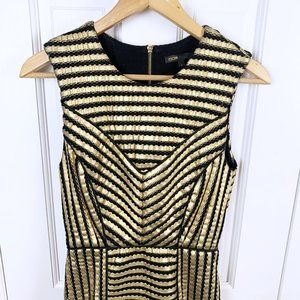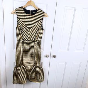 Rezzano sleeveless honeycomb knit dress. A mid-thigh length sleeveless dress gold-tone metallic technical knit. Rounded neck, back zip fastening & wide frill at back & sides of bottom of skirt. The cut is fitted cut & waist accentuated. Cut-out effect & linear design, assertively graphic. Fully lined