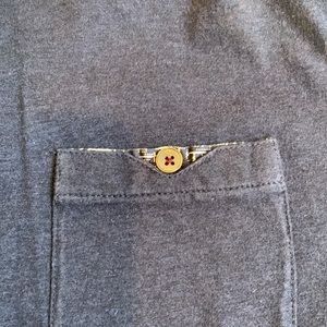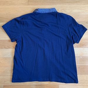 Excellent used condition: worn once, cleaned and forgotten about. Navy blue, short sleeve polo with signature collar and pocket contrast. Purple around collar and button area. Please see photos for measurements and style. Thank you.