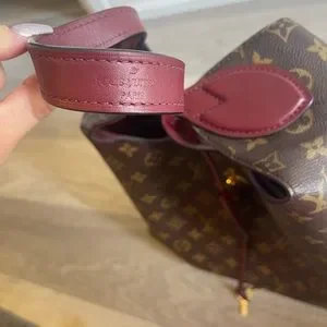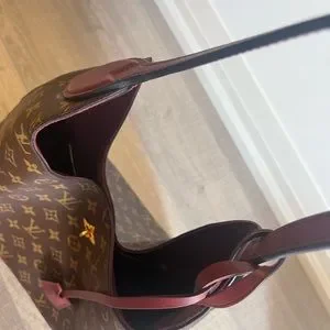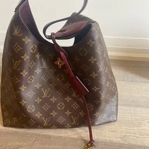 Beautiful Louise Vutton purse with tons of room. Beautiful maroon material inside and on accents, with gold. Two interior side pockets with lock on one side and zipper on the other. Comes with two keys but no lock. Some wear on strap, interior, and corners.