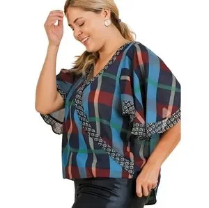 Plus Size Plaid V Neck Faux Wrap Flutter Sleeve Blue Top