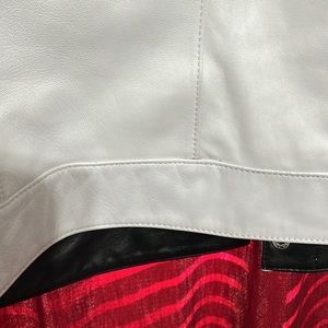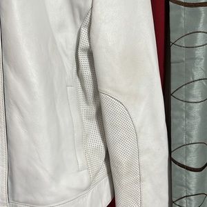 Venus Williams for Wilson’s leather white leather jacket. The pit to pit measures 20 by 23 long. Very minor flaws listed in pics. The flaws do not detract from jacket they are hard to see from a distance. Zip up and pockets snap at neck airy design. Size Large.