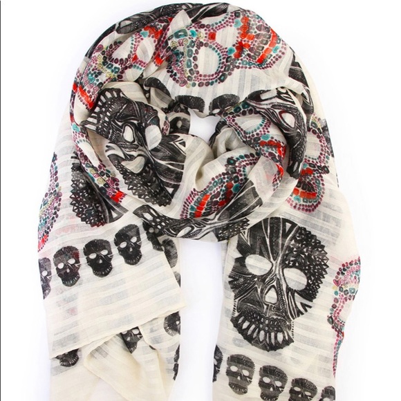 Super cute lightweight white oblong multicolored sugar skull scarf. Just in time for fall.