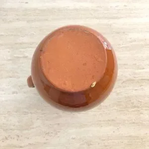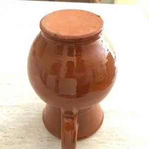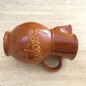 This handmade terracotta pitcher is beautiful in its simplicity. Perfect for sangria, wine or any type of juice. It has a pinched spout to hold in the fruit or ice. It has a lead-free clear glaze which gives it a burnt sienna color. It has 'Sangria' written in yellow on the front with a coffee style thick curved handle. Purchased and handmade in Spain. Excellent condition. Holds 64 oz of liquid. Measures 8.75" H x 3 3/8" W.