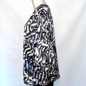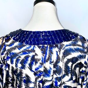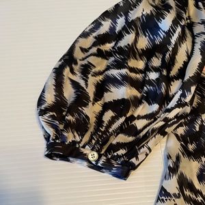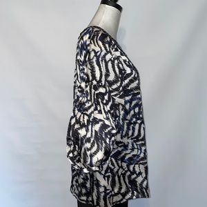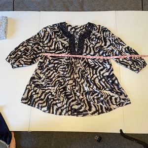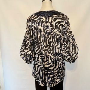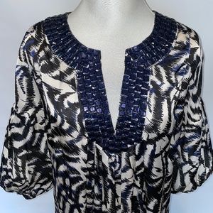 Loose fitting top with deep navy blue jewel embellished neckline. Silk fabric print in white, black & navy. Bust up to 38”, length measures 26” from top of shoulder. Full, button at elbow length sleeves. Size 6. Like new!