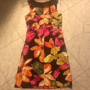 This sleeveless dress has great color, so many shoes will match! The black background and curved neckline add splash to these great colors; the dress could be worn as casual or even to a wedding depending on accessories.