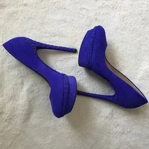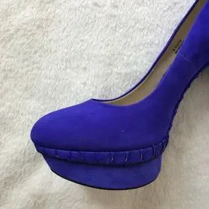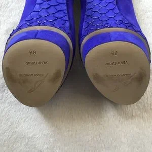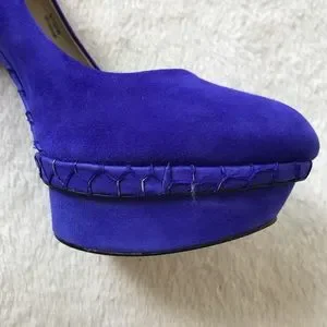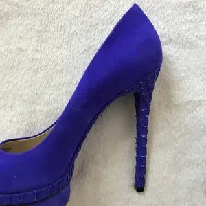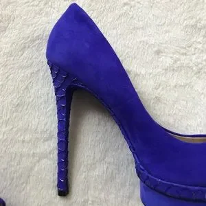 So much to say about these showstoppers 🔥- Purple ultra violet suede leather upper, leather sole, snake skin metallic textured heels, padded insole, 8.5M, platform 1.5 inch, stiletto 5.5 inch heels, Brand new, never worn and defect free. Made for a true stiletto wearing lady with style! 💯